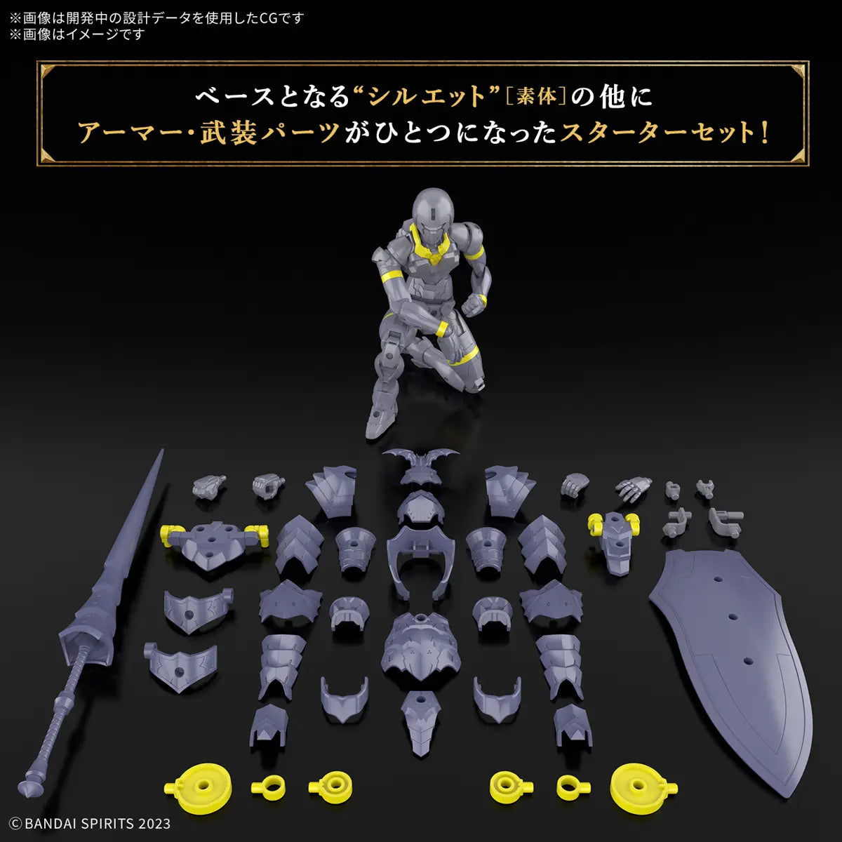 Bandai's "30MF (30 Minutes Fantasy)" figure-kit series allows you to create your own fantasy-based figures and characters! The starter set includes armor and armed parts in addition to the base "silhouette" (elementary body). The shoulder joints are designed with great care to keep the body line intact even in bold poses; the movable axes on the chest, torso, and waist work together with the sliding mechanism at the base of the waist joint to achieve natural poses. Armor and weapon parts are included to combine with the "silhouette" to "change jobs" to that of the Liber Lancer! His weapons are a lance and a shield; flexible movement is achieved by attaching the shoulder and waist armor via the joint on the back. The attribute of the Element Core is "lightning." Order him for your own collection today!