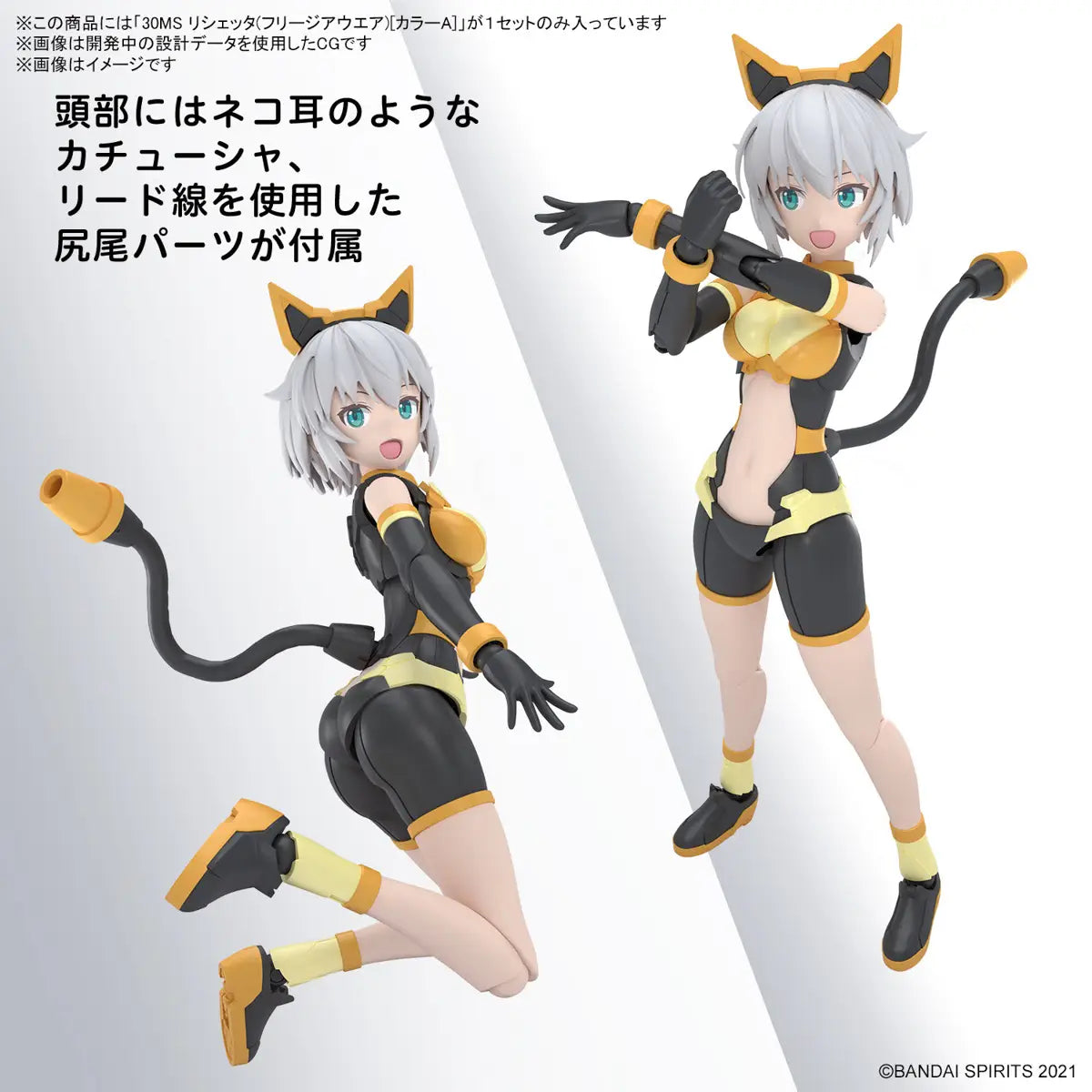 Rishetta returns to Bandai's "30MS (30 Minutes Sisters)" model-kit lineup with a completely new design! The parts on the runners are arranged in a way that's optimal to ease of assembly and efficient work flow, allowing for smooth assembly. You can customize her into her armed mode by assembling the armor parts! Three tampo-printed facial expressions are included: normal, smiling and confused; a large claw unit is suspended from her backpack, and it can be transformed and attached to an arm. The head comes with a cat-ears headband and a tail part made with lead wire for flexibility. The abdomen has a mechanism to prevent the hip joint parts from coming off, so the structure is designed to prevent them from separating when moving the legs during posing. Additional "30MS" optional parts such as faces, hairstyles and body parts are sold separately, so you can customize her to your heart's content! The soles of her shoes have 3mm joints suitable for customization, too. Order her for your own collection today!