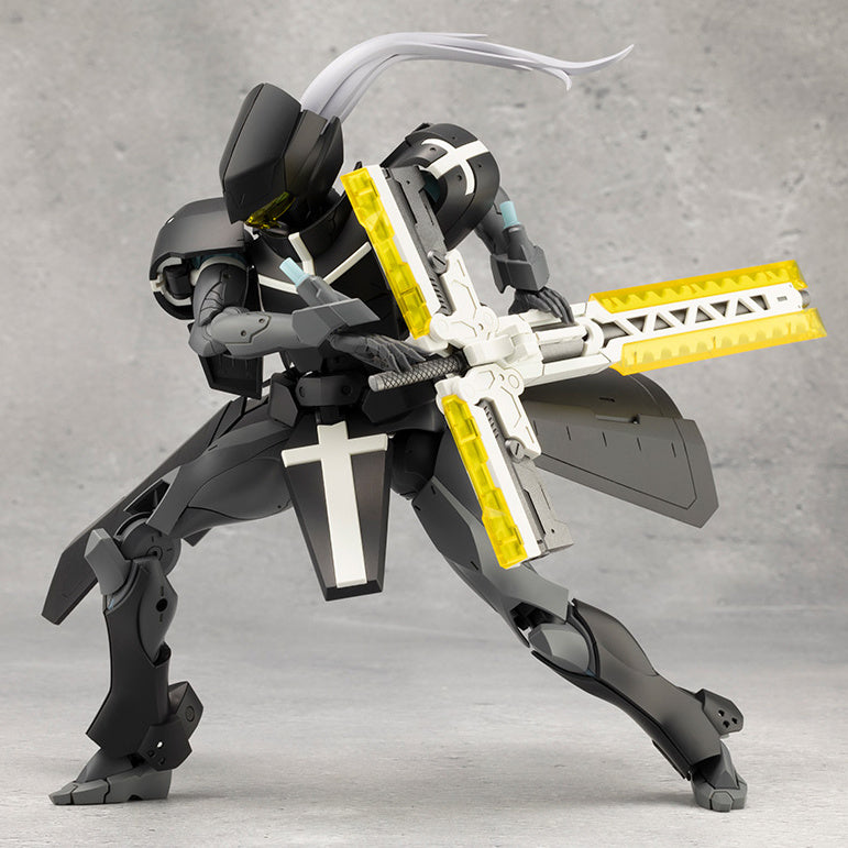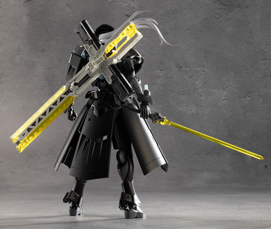 The composite weapon Grave Arms 2 is modeled after a cross; it's a giant cannon with a giant sheath holding a laser blade and two handguns inside! It can be transformed into a greatsword by using a partial transformation gimmick, and by removing the grip and attaching the effect parts, you can create a deadly laser blade that will greatly enhance heroic action! It can also be mounted on the figure's back with a flexible mounting arm.