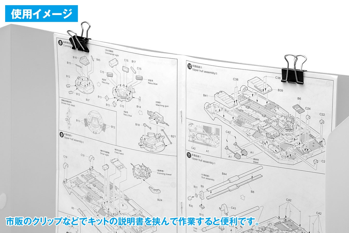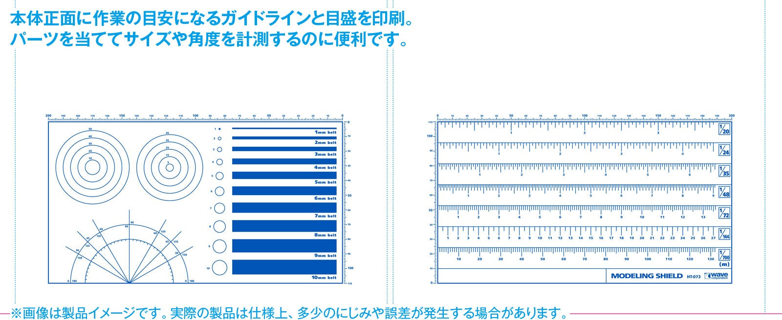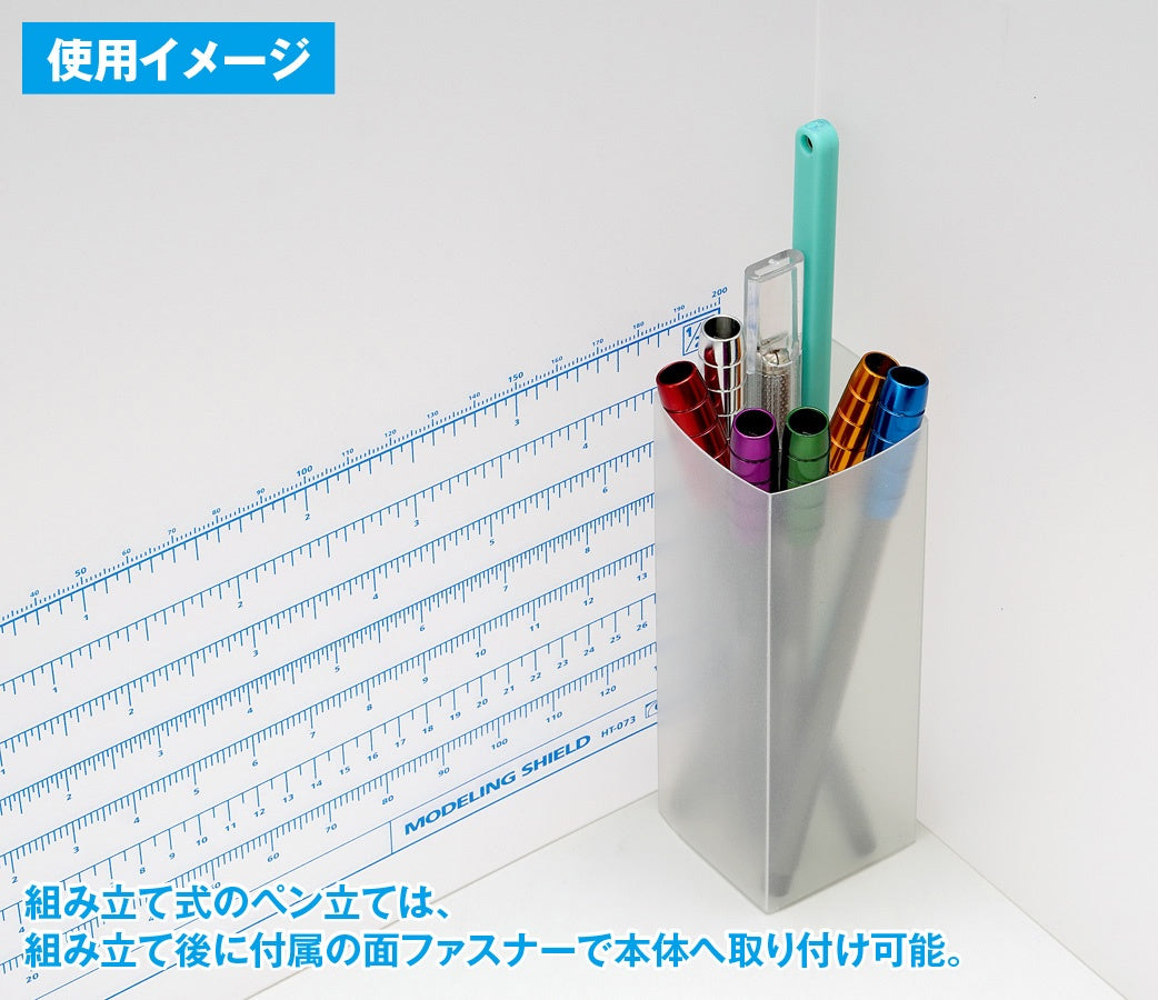 This desktop-folding partition is incredibly convenient for modelers -- you can easily secure your personal space just by setting it up! It prevents chips that fend to fly when cutting parts, as well as scattering of the parts themselves. The width when unfolded is about 51cm, so you can work with an A3-size cutting mat or a large model kit box. The front surface features printed guidelines and scales to serve as a guideline. The side features two types of hooks so you can easily hang frequently used runners and more. It's made of durable polypropylene, and it can be connected to other modeling shields with hook-and-loop fasteners. A hook that can be hung on the top of the main unit and an assembled pen stand are also included. Order yours now!